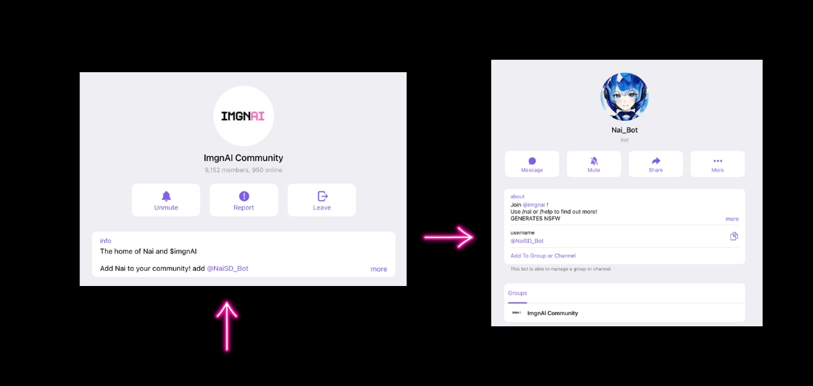 To double-check that you're using the right bot, you can also navigate to the imgnAI Community and click on the bot from there.