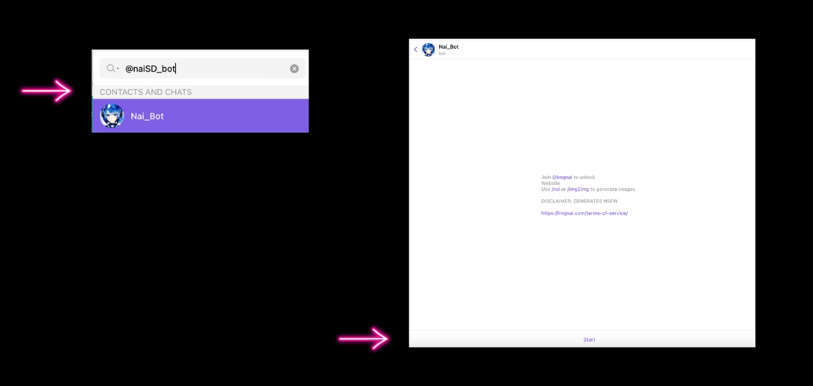 Using the search bar, search for @NaiSD_bot and click start to begin.