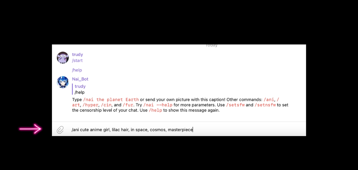 How to generate using Nai in DMs on Telegram.